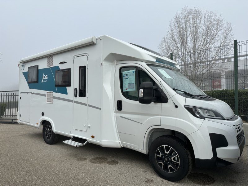 Descubre la Joa Camp J70T, una autocaravana de 7,00 M de longitud con espacio para hasta 4 personas. En su interior nos encontramos con un fantástico y espacioso salón con una cama abatible eléctrica encima, una cocina completa con 2 fogones y frigorífico de 133L, un baño con WC químico y ducha integrada y dos camas unibles que forman una cama king size en la parte trasera. Disponible en M3 Caravaning. ¡Ven a verla y empieza tu próxima aventura!