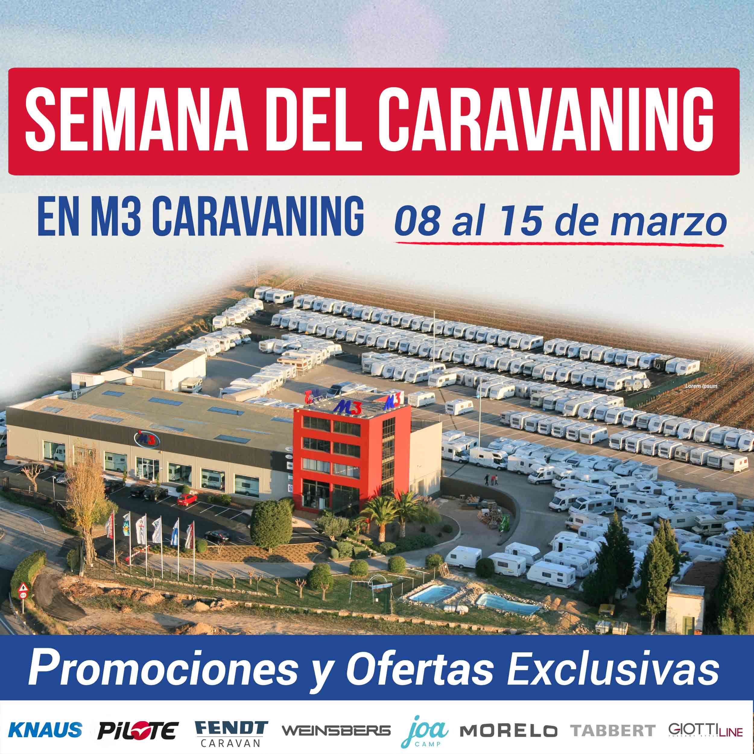 ¡Descubre la Semana del Caravaning en M3 Caravaning en Vilafranca! Del 8 al 15 de marzo del 2025 te esperamos con más de 150 vehículos de exposición: autocaravanas, caravanas y campers nuevos, de segunda mano y Km.0. Aprovecha promociones exclusivas y ofertas imperdibles en las mejores marcas del mercado, como KNAUS, WEINSBERG, PILOTE, FENDT, JOA, MORELO, TABBERT, TAB y GIOTTILINE.